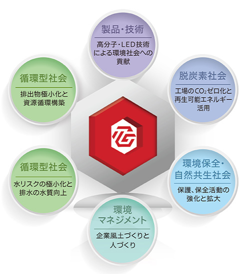 ゴム・樹脂の高分子分野の専門メーカーである当社が象徴としている六角形の「ベンゼン環」(高分子の原点となる構造体)にちなんだ「6つのチャレンジ」を掲げ、2050年を見据えた長期的視点で環境保全活動を推進しています。また、その実現に向けたロードマップとして、マイルストーンを2030年に置き目標設定(Targets 50&50)し、さらに5カ年計画として環境取組みプランを策定して活動しています。