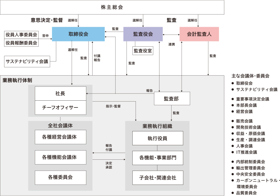 また、執行役員制度を導入し、意思決定と業務執行の迅速化を図っています。さらに、2023年6月にチーフオフィサー制度を導入し、社長の権限と責任の一部をチーフオフィサーに委譲することにより、重点機能について事業本部・地域本部の枠を超えてグローバル全体で管理し、戦略性の高い業務執行の実現と経営のスピードアップを図っています。加えて、2024年6月には取締役会の決議権限を一部執行側へ委譲しました。これにより、取締役会の経営戦略議論をより充実させるとともに、重要事項決定会議を新設し、さらなる執行のスピードアップと自律した経営を図っています。経営の重要な事項については、重要事項決定会議、本部長会議、経営会議を毎月開催し、さらに安全・品質・環境・技術・収益・人事などの主要機能に関する機能会議体および各種委員会を適宜開催し、的確な経営判断を行っています。