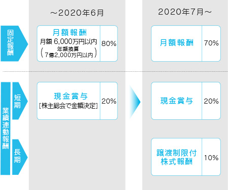 取締役の月額報酬と賞与の報酬総額は、年額6億5千万円以内(社外取締役分を含む)、社外取締役を除く取締役の譲渡制限付株式の報酬総額は、年額1億円以内と、2020年6月12日定時株主総会で決議されています。