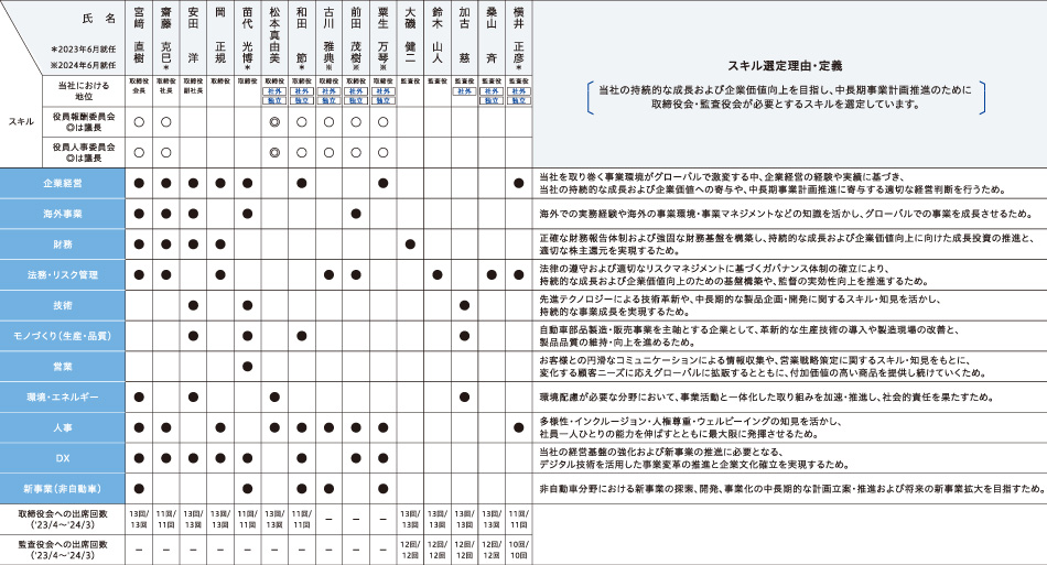 豊富な経験と高い見識を持つ5名の方々に社外取締役になっていただいており、主に会社経営、モノづくり、環境・エネルギー、海外、行政、先端IT、DX分野、新規事業創出、人材育成、組織マネジメントなどの分野の豊富な経験と高い見識をお持ちです。また、取締役会のさらなる多様性と女性活躍の推進に向けて、当社初の女性取締役である松本取締役に加え、新たに粟生取締役を選任しました。