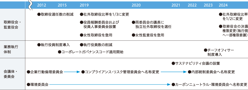 2012年に執行役員制度を導入し、取締役総数を2011年の23名から9名に削減し、2015年には社外取締役を初選任しています。