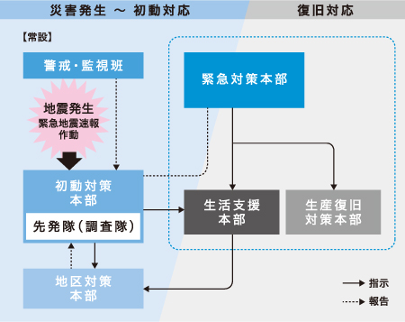 当社では、南海トラフ巨大地震や気候変動による自然災害などの大規模災害を想定して、「人命第一」「地域支援」「早期復旧」を基本とする危機管理体制を整えています。具体的には「危機管理統括プロジェクト」を中心にハード・ソフト面の対策に加えて、災害時の対応者のスキルが不可欠と考え、役員をはじめとする対策本部メンバーの「レジリエント訓練(災害模擬演習)」を2013年度から全社で延べ210回以上実施。また、生産復旧体制の整備として、被災した建屋・設備・工程の復旧と代替生産の手順の具体化を進めています。