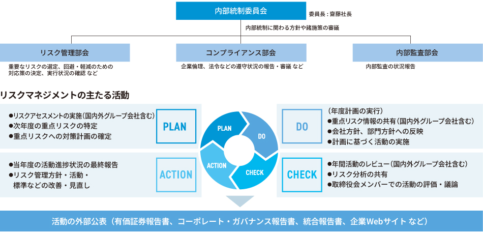 社長を委員長とする内部統制委員会では、事業戦略リスクと経営基盤リスクについて、重点リスクの選定、対応策の決定、対応策の実行状況の確認などを行い、より実効性のある対策を実施しています。加えて、取締役会では、重点リスクや政情不安などによる突発的な事業リスクへの取り組みについて議論し、継続的な改善を行っています。