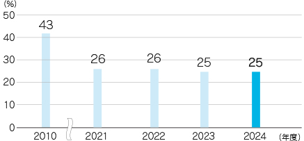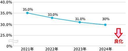 全社の喫煙率は、2010年の42.5%から2024年は25%までに減少しています。