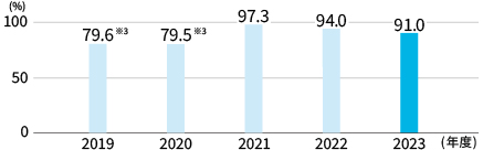 ワーク・エンゲージメント 下記①~③の設問の肯定的回答率(5段階中4,5)の平均値 ①私は、業務上期待されている以上の貢献をしようと思う ②私は、仕事を通して個人として達成感を感じている ③私は、当社で働くことを、知人に積極的に勧めたいと思う |