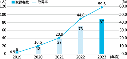また、健康保険組合では人間ドックの費用補助、郵送によるがん検診の費用補助(自己負担ゼロ)を実施しており、その受診率向上施策の1つとして、節目年齢における人間ドック特別休暇を付与し、受診しやすい環境を整えています。