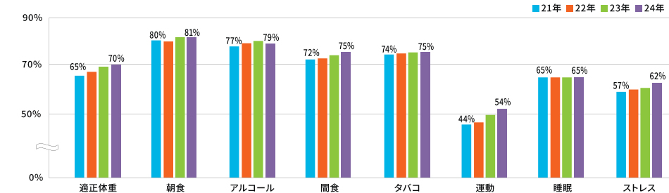 - ※10 健康チャレンジ8:体重・朝食・間食・喫煙・運動・睡眠・ストレスの8項目