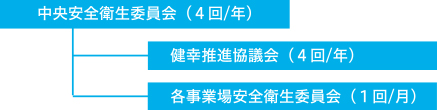 中央安全衛生委員会※9の下部組織として、健康経営の拡充を目的に「健幸推進協議会」を年4回開催しています。この協議会では健康だけではなく、「幸せ」に働くことを目指し、安全健康推進部を事務局に、産業医・人事部・健康保険組合・労働組合が一体となって、健康経営・幸福経営活動の協議を行っています。また、協議・決定事項は各事業所の安全衛生委員会へと展開しています。