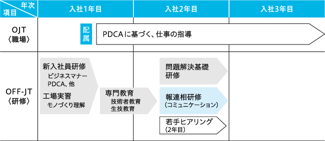 若手が入社後3年間で独り立ちをするための制度「若手OJT制度」を導入しています。PDCAサイクルに沿った仕事ができるように、職場でのOJTと研修の両輪を回し、若手の早期育成を図ります。