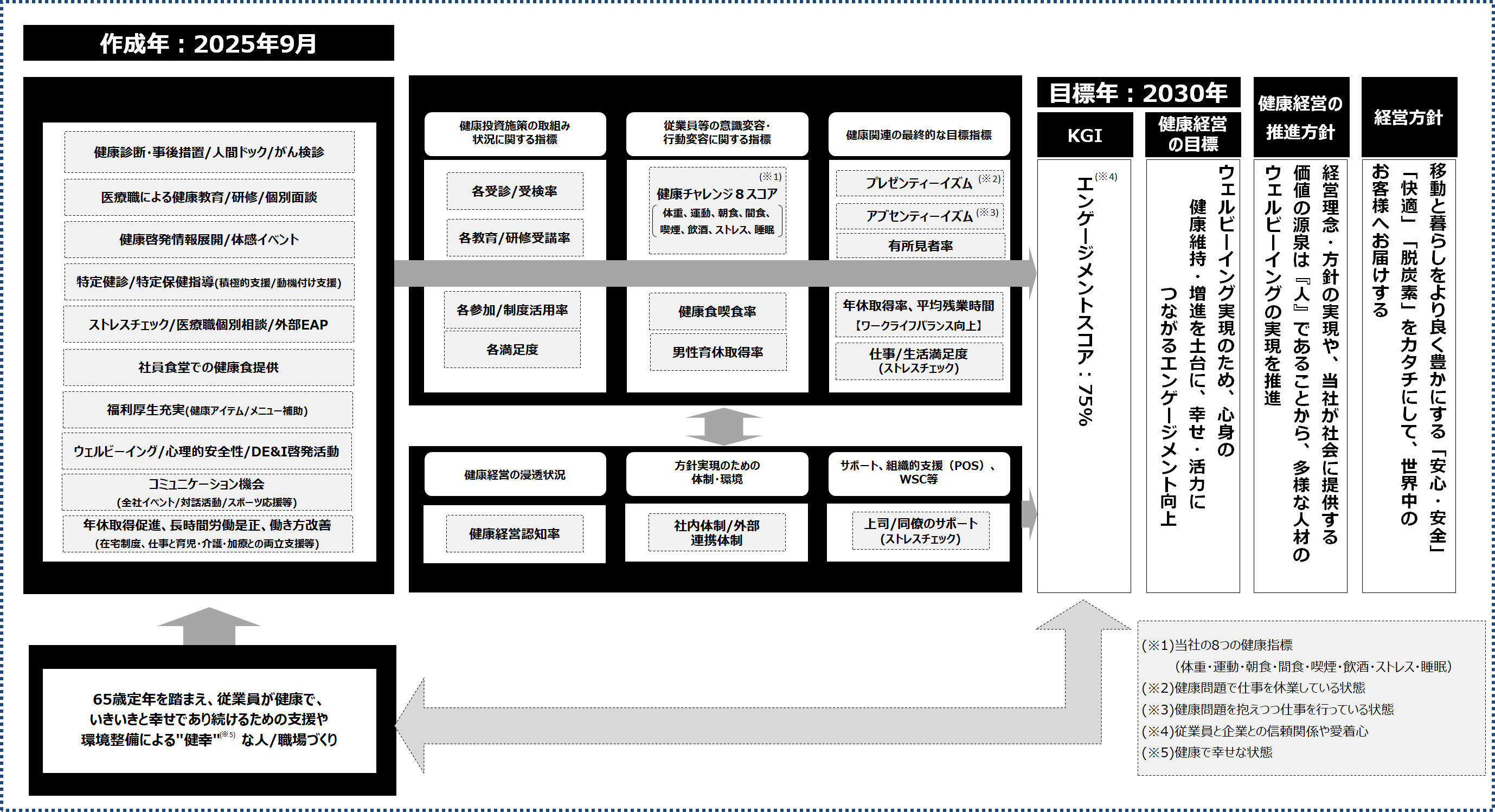 2025年に改訂した戦略マップでは、健康経営の目標として、「ウェルビーイング実現のため、心身の健康維持・推進を土台に、幸せ・活力につながるエンゲージメント向上」を掲げ、エンゲージメントスコア75%達成をKGIに置き、健康風土の醸成のために活動、健康づくりや啓発活動などの健康投資を積極的に推進しています。