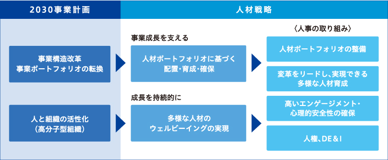 当社は、2030年事業計画において、経済的/社会的価値を再定義し、それを実現するために事業構造の改革を進めるとともに、環境の変化に柔軟に対応し、新たな価値を創出できる「高分子型組織」をめざして、人と組織の活性化に取り組んでいます。