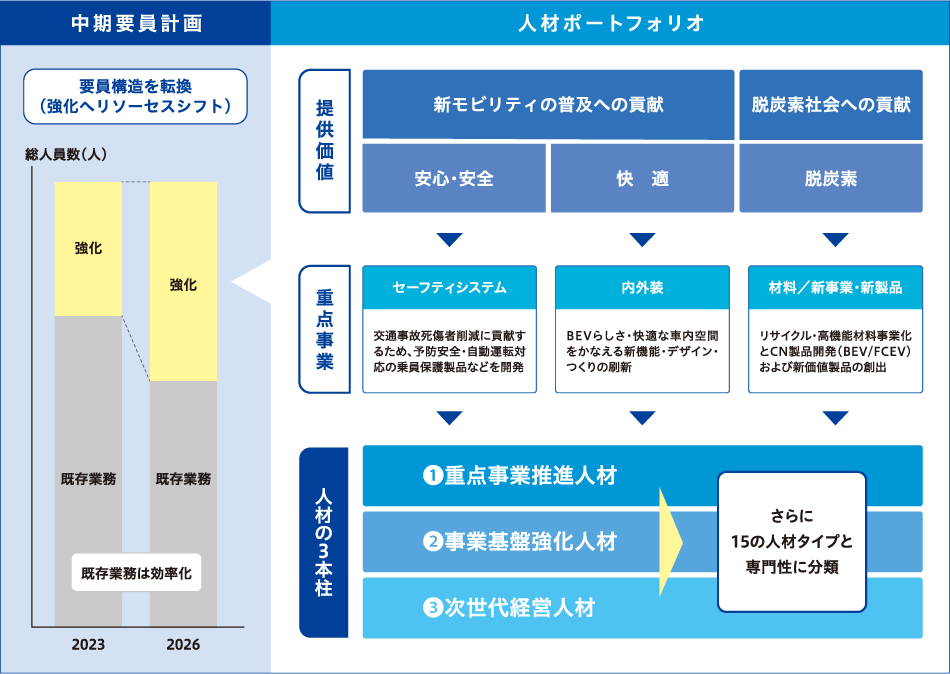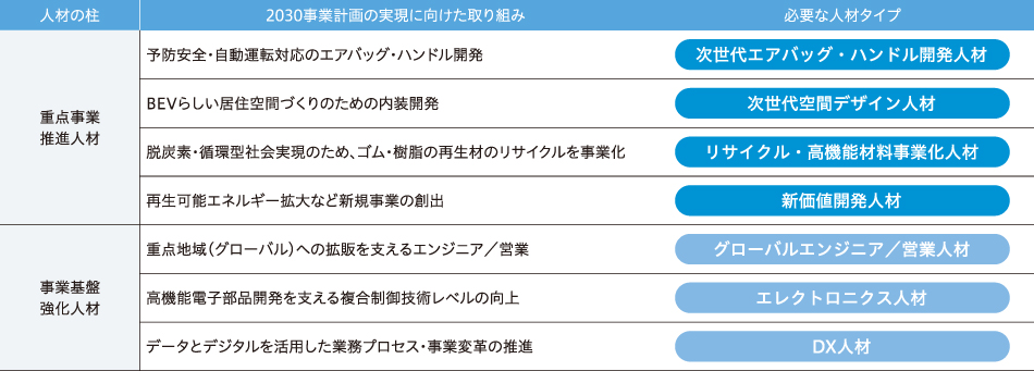 「人材の3本柱」のうち、1つめの柱である「重点事業推進人材」は、2030事業計画の重点事業である「セーフティシステム」「内外装」「材料/新事業・新製品」の開発に携わる人材とし、事業計画実現に向けて配置・確保により力を入れていきます。