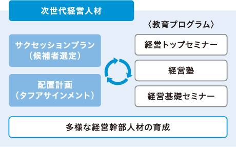 3つめの柱は、将来の経営を担う「次世代経営人材」です。将来の経営を担う人材の計画的育成のため、経営戦略上の重要ポストと職責遂行に資する幹部要件を明確化し、サクセッションプランによる候補者の選定・計画的な教育・配置(タフアサインメント)の仕組みを導入しています。