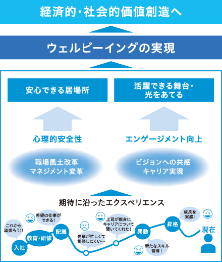 事業の持続的な成長のために、「ウェルビーイングの実現」は不可欠であると考えています。その実現に向け、従業員が入社後に体験するエクスペリエンスを通じて、心理的安全性の確保やエンゲージメントの向上に取り組んでいます。