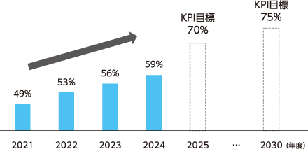 2024年より、多様化する価値観や社会環境の変化をふまえ、従業員一人ひとりのウェルビーイングを実現するために不可欠な「心理的安全性」と「エンゲージメント」を支える「エクスペリエンス(仕事やキャリアが従業員の期待に沿った体験となっているかを測るもの)」を確認するためにサーベイを更新。この変更に伴い、エンゲージメントを測定する設問を5問から3問へ変更※1しました。目標値については維持し、2025年には70%を目指します。サーベイ結果に基づき、一人ひとりのモチベーションの源泉を把握し、より高いエンゲージメント、その先にはそれぞれのウェルビーイング向上につながることをねらい、「従業員目線」で期待に沿ったマネジメント施策を実施しています。