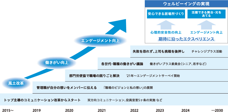 2015年に労働組合が実施したアンケートにより、「内発的な働きがいが低い」との結果が示されて以降、職場風土改革を推進してきました。職場内のコミュニケーション促進、トップメッセージの発信、働きがいを高める委員会の発足、社外講師による講演会など、職場風土とマネジメントの両面から取り組みを継続しています。