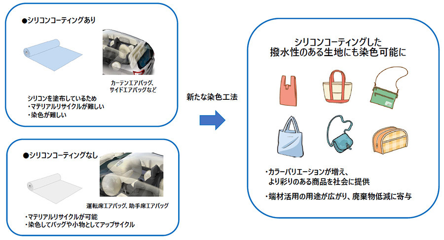 今回、衣類の染色や加工を行う株式会社艶金(岐阜県大垣市)の協力によりシリコン塗布した生地の染色を実現、カラーバリエーションが広がることでエアバッグ生地の活用拡大につながります。なお、新たな染色工法を用いた商品として「エアバッグカラートート」を2月20日より販売します。
