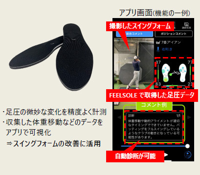FEELSOLEは、内蔵したゴム製の圧力センサ(e-Rubber)により、足裏の圧力の微妙な変化を精度よく計測できることに加え、大きな変形に対応する高い柔軟性を持つことが特長です。専用アプリと組み合わせることで、スマートフォンやタブレット端末に足圧の変化を色の濃淡(ヒートマップ)で表示し、体重移動の変化を可視化します。また、スイングフォームの自動診断機能により、フォームの改善に役立つアドバイスや練習動画を確認でき、一人ひとりの課題に合った練習が可能です。