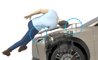 歩行者と衝突した際にフードを瞬時に持ち上げ、フード下の硬い部品との間に空間を確保することで頭部などへの衝撃を緩和します。