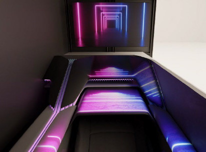 乗員の体調や気分をレーダでセンシングし、状態に合わせて車室内を光・音・香りなどで演出することで、リラックス空間を創出します。実際に会場で体験いただけます。