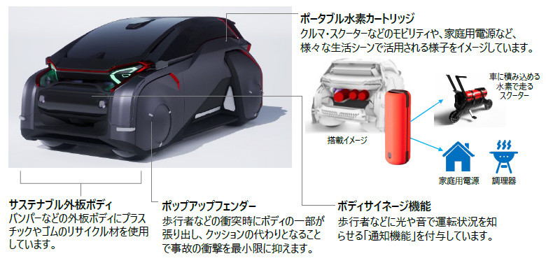 当社の将来技術を搭載した、水素(Hydrogen)で走る燃料電池車(コンセプトモデル)。