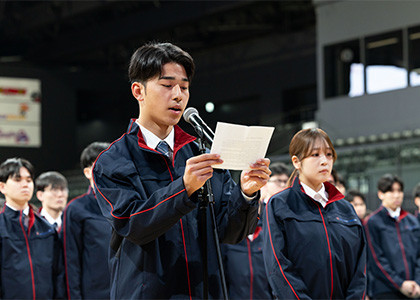 入社式には、新入社員199名と役員や各部門長、労働組合などの関係者101名が出席。式典では、辞令交付、社長挨拶に続き、新入社員代表が誓いの言葉を述べました。