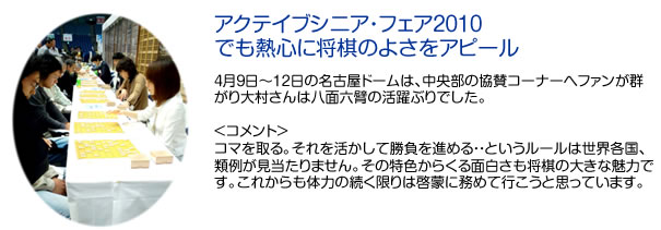 元気なOB頑張っているよ 将棋(大村欽一さん) 将棋の普及に努力の毎日 大村欽一さん(2010年度TGOB会入会) 大村さんは、愛知県将棋連盟(日本将棋連盟所属の組織)の会長を2003年度から務める一方県下の34支部、800名を上回る会員のさらなる拡大、将棋の普及に傾注しておられます。愛知県は全国屈指の将棋の盛んな土地柄となり、普及指導員100名超の県連盟の体制はわが国ナンバーワン。関係各方面から注目を集めていますがなお積極的に活動中です。 目次に戻る>>