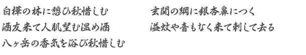 木覆脱ぎて白足袋のまま 鈴木定夫――この句は2014年3月、OB会で城崎温泉に旅行したとき、旅館の下駄を履いて散策している途中、鼻緒に擦れて指が痛くなり、いささか格好悪いと思いつつ〝世間体〟を脱ぎ捨て裸足で歩いて帰った記憶が脳裏によみがえり、この付句ができた次第です。