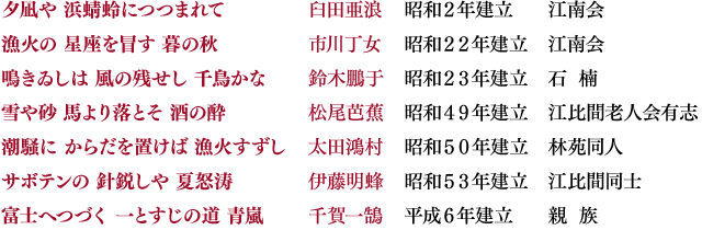 - 昭和49年に江比間老人会の有志によって、芭蕉の句碑が建立された。その後幾つかの句碑が建てられ、現在見られる句碑公園としての趣あるたたずまいが整えられた。