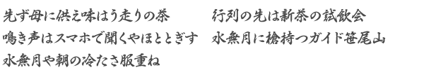 季節の初物を仏壇にお供えして「味をきく」優しさに触れ、この付け句ができた。毎日の食事を通じて、近頃家内の味付けが亡き義母の味付けにどこか似てきた・・と思えることがあった。また老舗の料亭では代々の味を受け継いでいるとか。どこの家にも相伝の味があるに違いない――と。