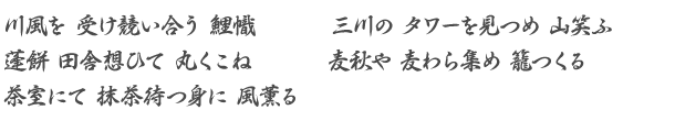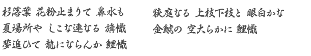 1.<課題句>=「鯉幟」(五月幟、座敷幟、初幟、五月鯉、吹流し、矢車)