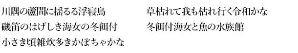 次・1月号の<課題>は、新年一切、寒一切です。締め切りは、1月18日(月)です。