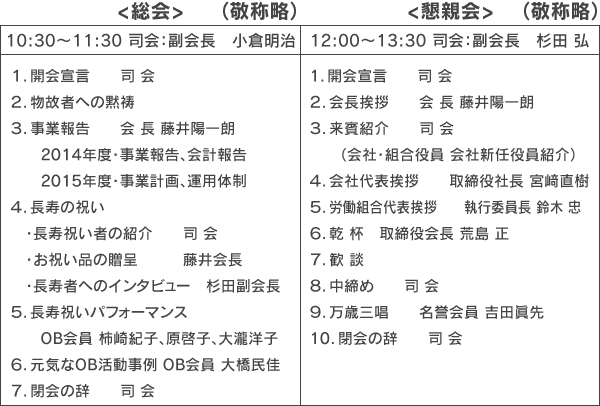 2014年度 総会・懇親会(本部) ≪総 会≫■長寿の祝い 藤井会長より 記念品贈呈 杉田副会長・・代表インタビュー ■長寿の祝いパフォーマンス 柿崎紀子さん 原 啓子さん 大瀧洋子さん ■元気なOB活動事例 〝地域のみなさんとともに〟 発表 ■来賓挨拶 ■展示コーナー ■万歳三唱 発声は 吉田眞先 名誉会員 ―――勢いよく またの再会を約して散会 <<前のページヘ 次のページヘ>> <<巻頭文へ戻る