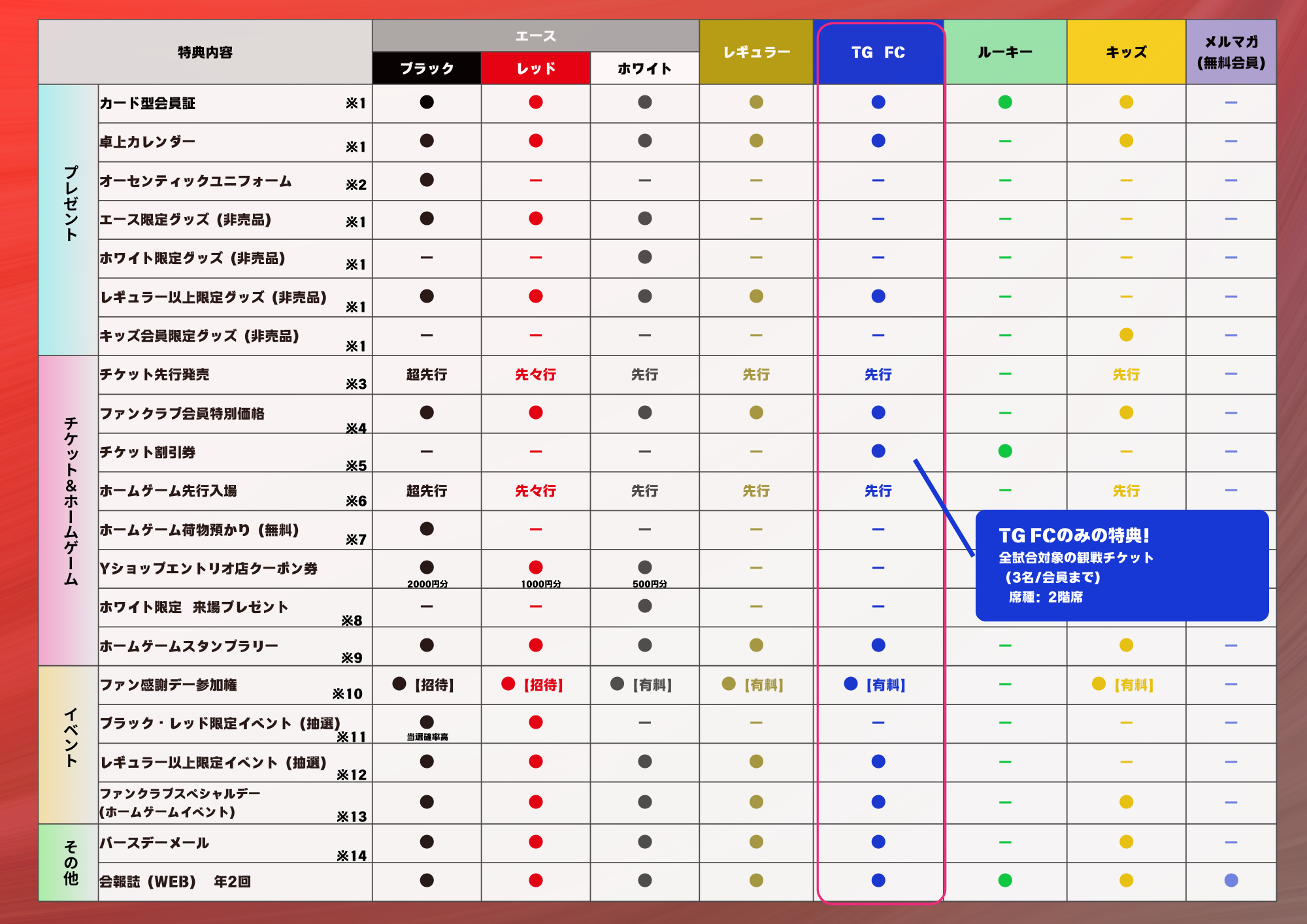| 1-2.特典: | ①オリジナルパスケース ②チケット引換券2階席TG応援エリア ◇各試合、会員1名につきご家族3名様(本人含む)までとなります。 各試合先着となります。予めご了承ください。 |