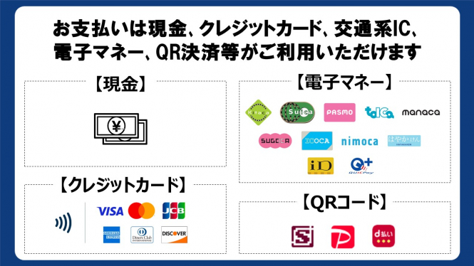 現金、クレジットカード、交通系IC、電子マネー、QR決済等がご利用いただけます。