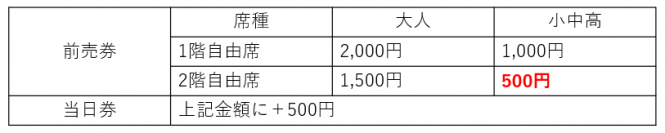 2階席自由席(小中高)の前売券価格を 1,000円 → 500円 に変更いたしました。