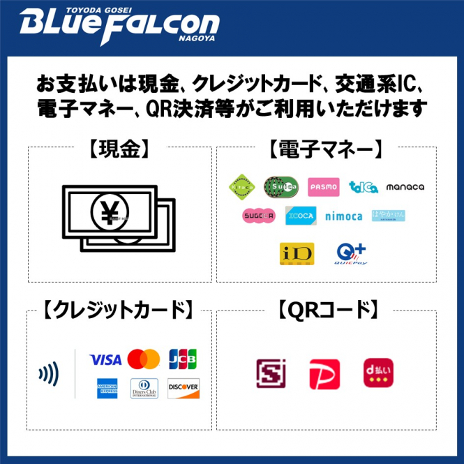 現金、クレジットカード、交通系IC、電子マネー、QR決済等がご利用いただけます。