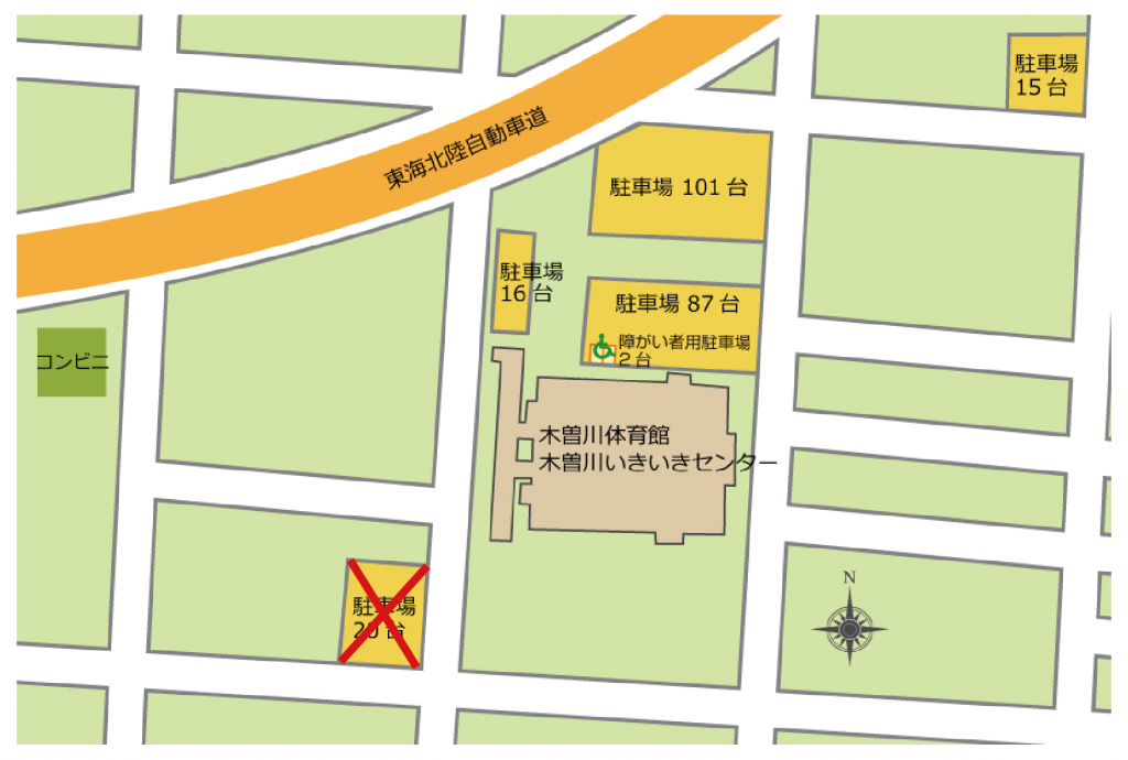 ※スポーツセンター駐車場入口付近・公道での駐停車はご遠慮ください。